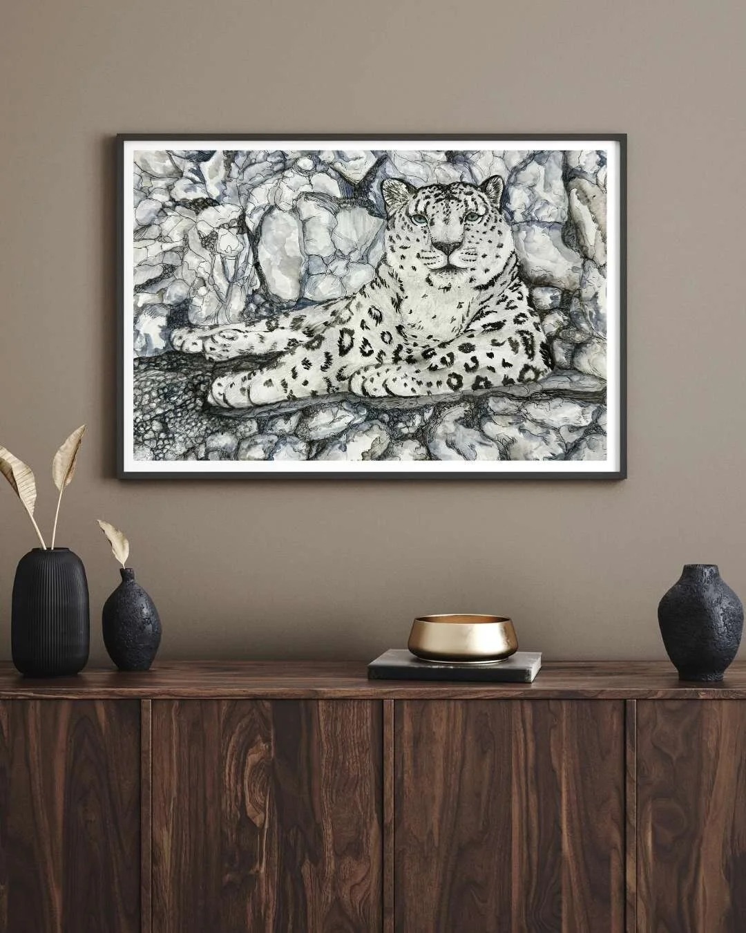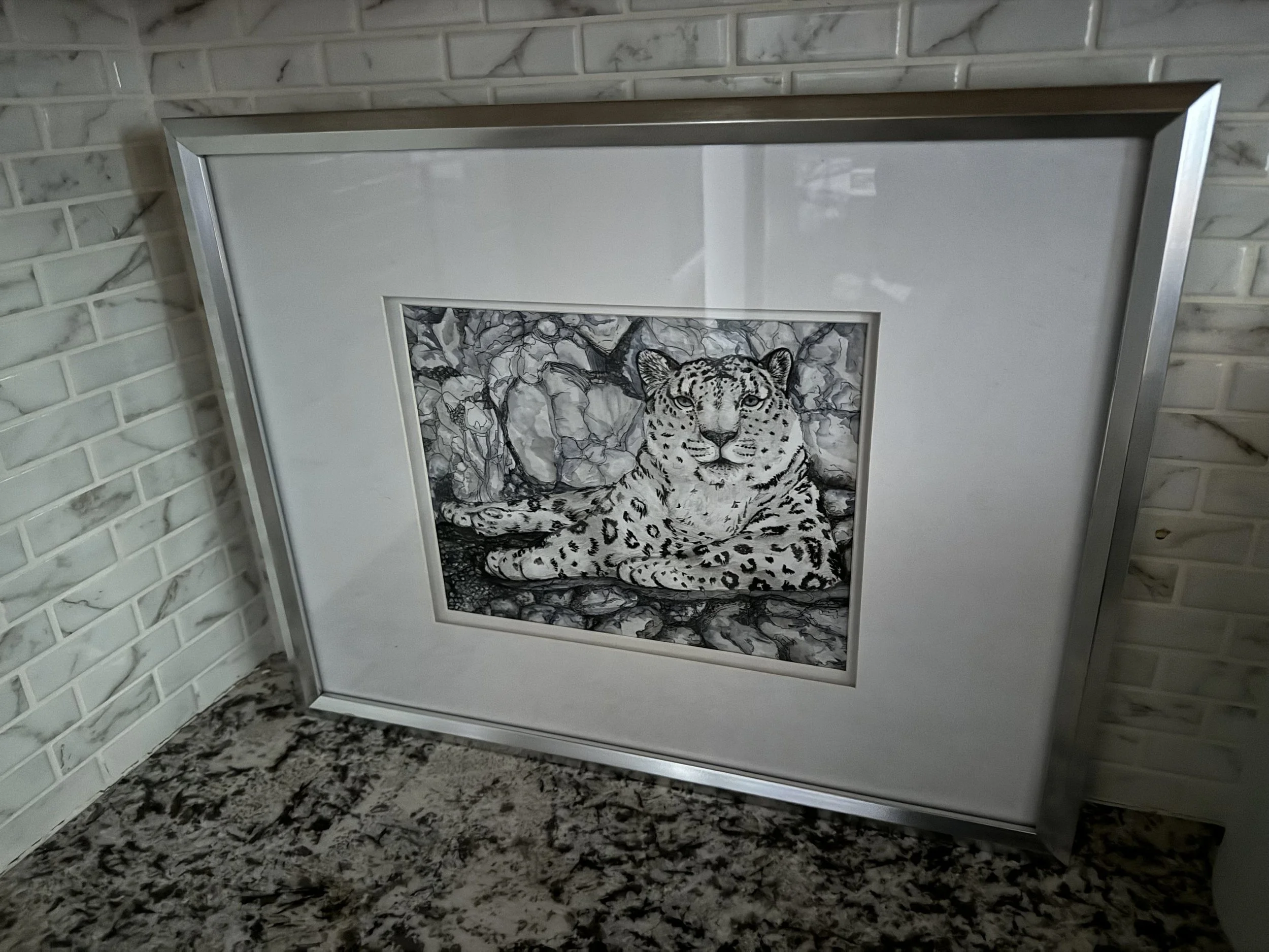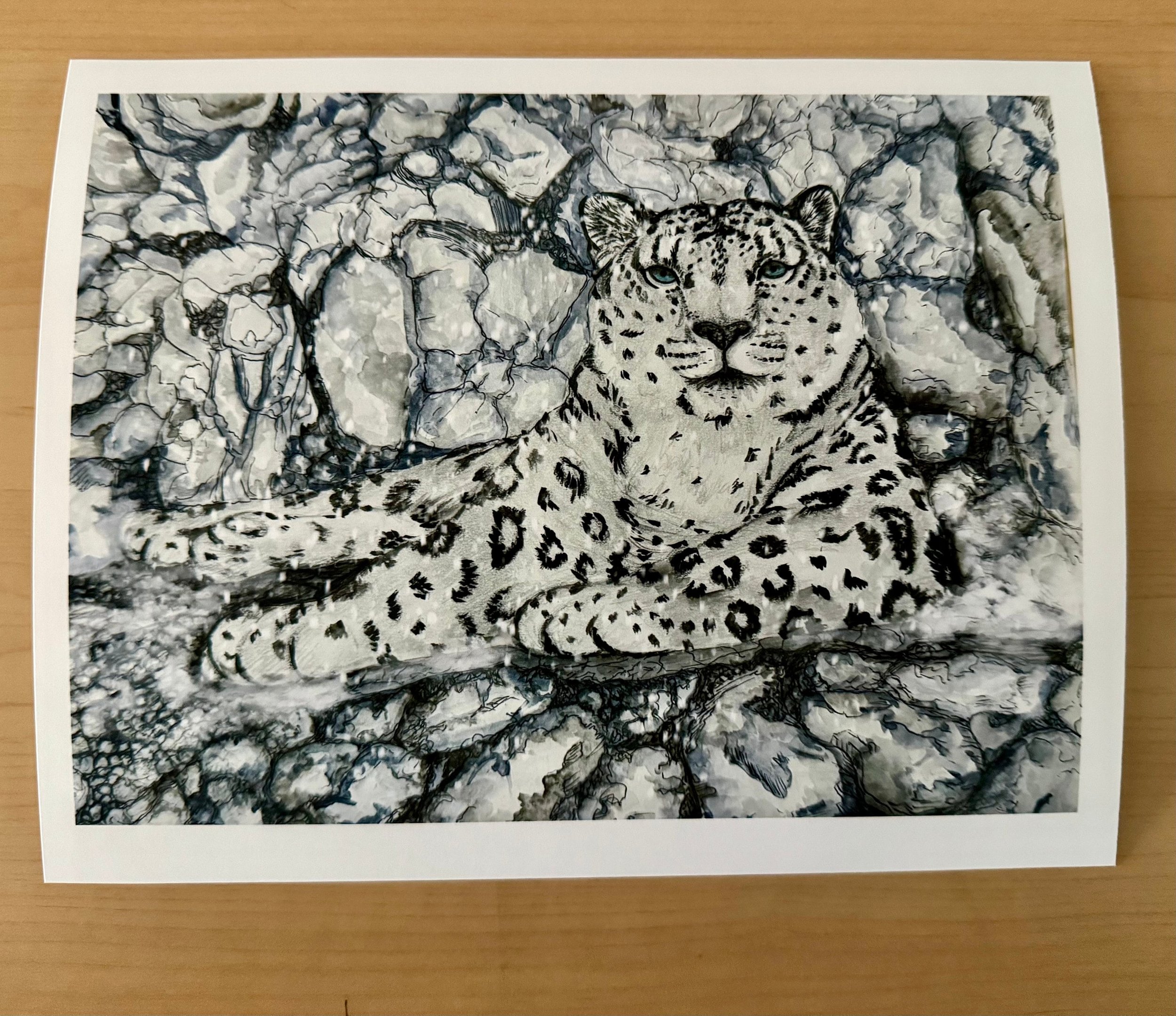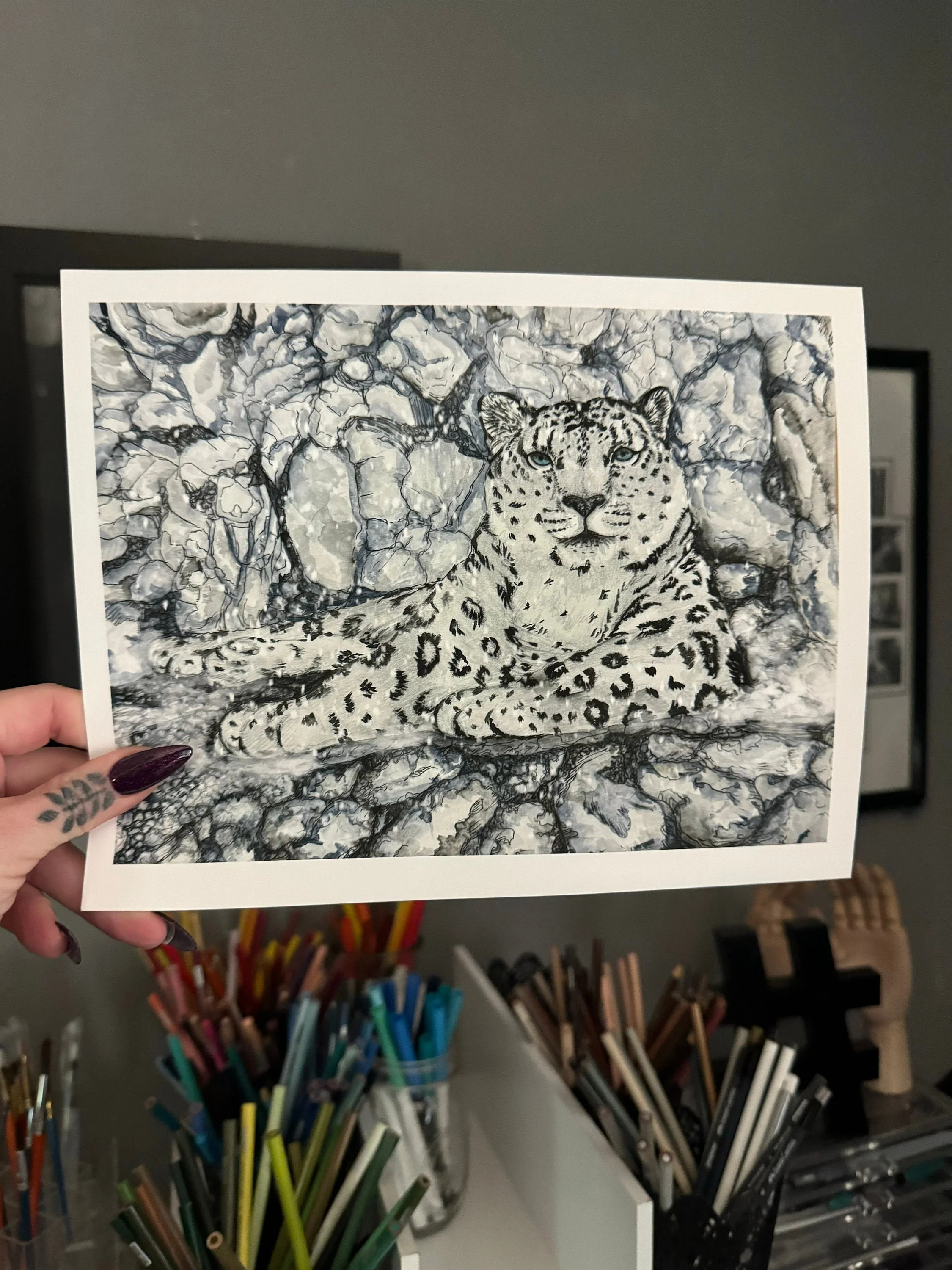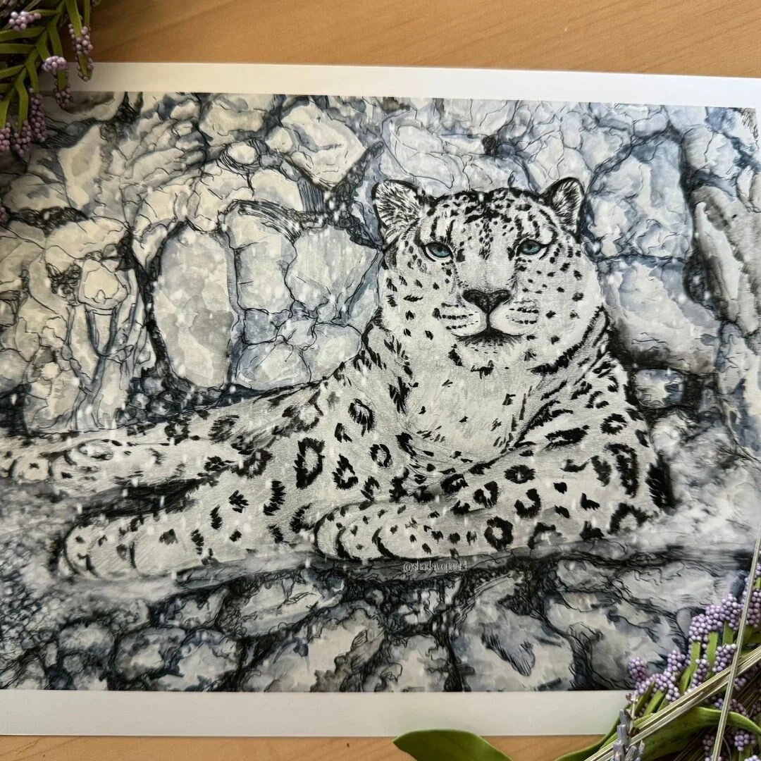 The art piece, Autonomy, is a truly unique depiction of a majestic snow leopard at peace in the Himalayan mountains. I imagined her restoring her energy before the next climbing adventure she embarks on to search for her next meal as a gentle snow falls. This captivating artwork was meticulously created using a blend of graphite pencils, watercolor paints, ink pens, and acrylic paint, resulting in a one-of-a-kind mixed-media piece.